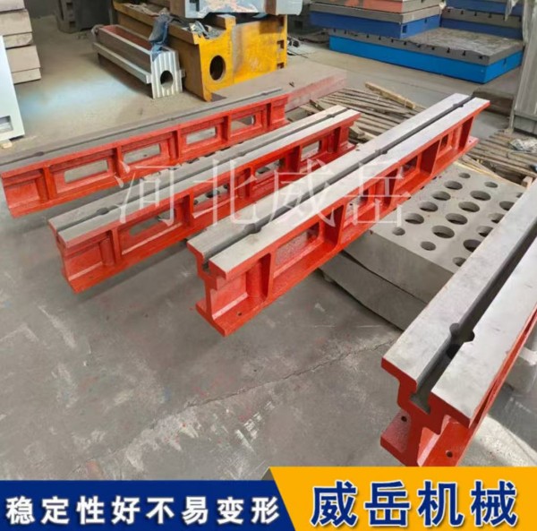 其次,根据承重需求匹配地轨规格,拒绝盲目选型。铸铁地轨的规格主要体现在截面尺寸、长度、槽型设计上,承重是核心参考依据。截面尺寸越大、壁厚越厚,地轨承重能力越强,常规轻型地轨截面尺寸多为150×150mm、200×200mm,适合3-10t载荷;中型地轨截面250×250mm、300×300mm,适配10-30t设备;重型地轨截面≥350×350mm,可承接30t以上超重载。同时,T型槽数量与尺寸需匹配固定螺栓,按需选择单槽、双槽或多槽地轨,确保设备、工装固定牢固。ink1601">http://www.chinaweiyue.com/